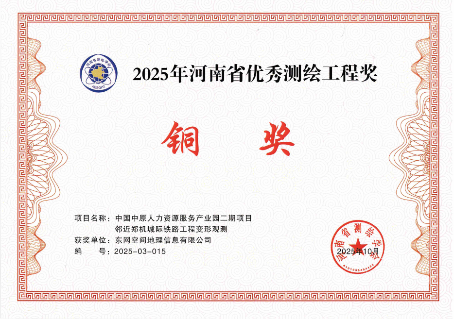 近日,河南省测绘学会举办的2025年优秀工程奖结果出炉,东网空间地理信息有限公司获得《中国中原人力资源服务产业园二期项目邻近郑机城际铁路工程变形观测》项目铜奖,这个奖项的获得,也是我司在此测绘行业中能力的有力证明。